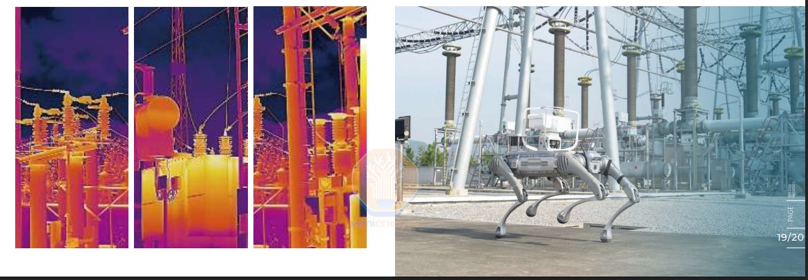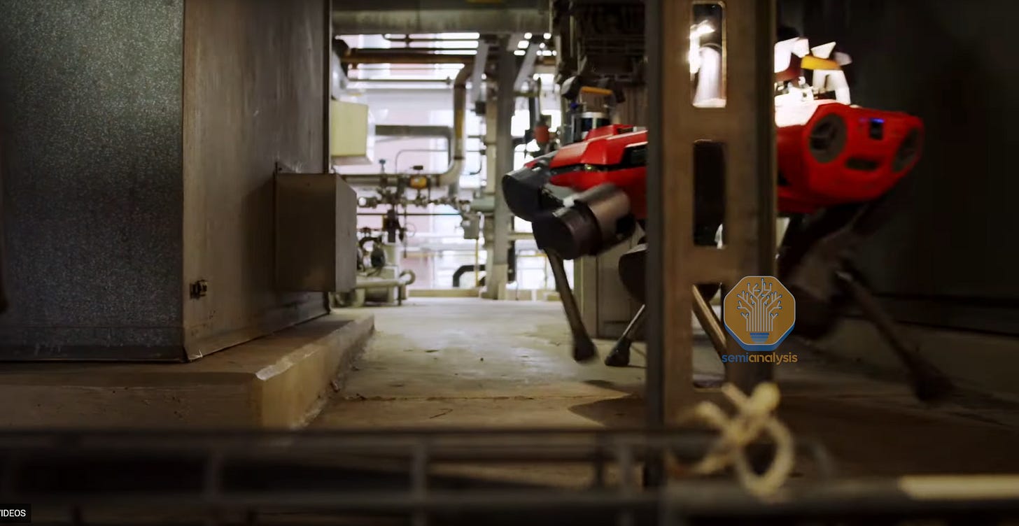 Datacenters: In hyperscaler datacenters, downtime can cost ~$1M per day. These quadrupeds may inspect the electrical yards, determining on acoustic and thermal levels if the substation equipment is in order. For cooling infrastructure, ensuring no leakage, uneven coil temperatures, or unusual fan vibration could jeopardize the training/inferencing. The quadruped will likely be outside for much of its time, requiring a higher IP rating in harsh weather, or longer battery duration to inspect the massive sites.