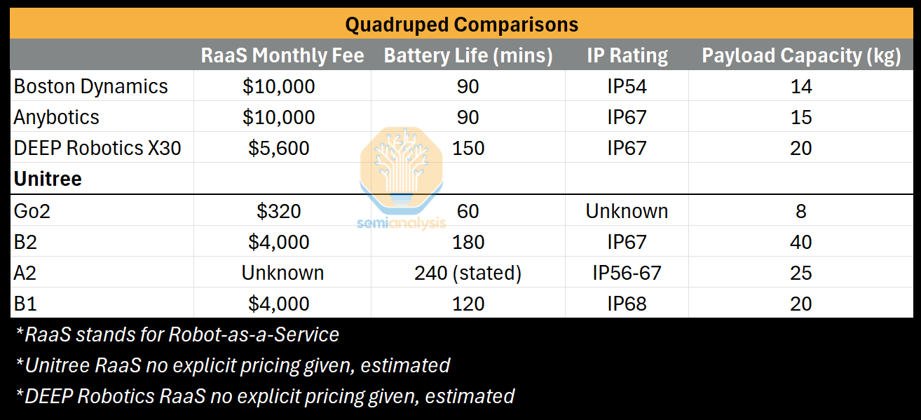 Western quadrupeds typically use Robot-as-a-service, charging ~$10K per month. But without the Chinese supply chain strengths, they still cost significantly more than Unitree.