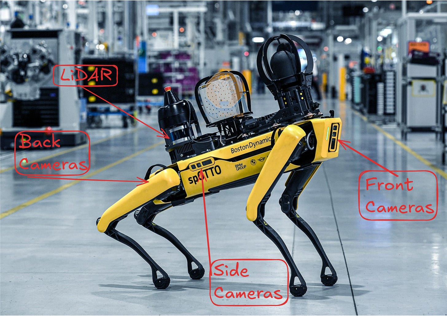 To navigate the world, quadrupeds rely on a standard sensor setup: cameras on all sides for a full field of view, a central LiDAR for 360° coverage, and often Time-of-Flight sensors for depth perception. These can rack up to 20% of costs on a quadruped. While designs vary, like Unitree for example, omits side cameras and leans more on LiDAR, full coverage is essential for safety.