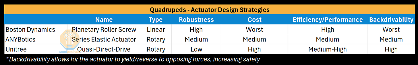 Unitree opts for a Quasi-direct-drive (QDD) style actuator, similar to the MIT Cheetah 3 (2018). This sees strong efficiency and very low costs, but less robustness.
