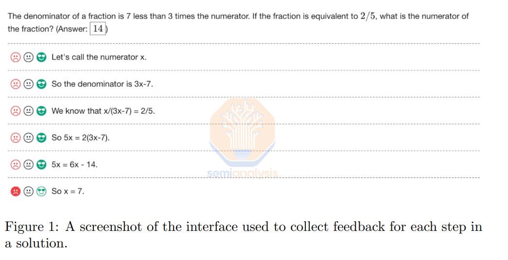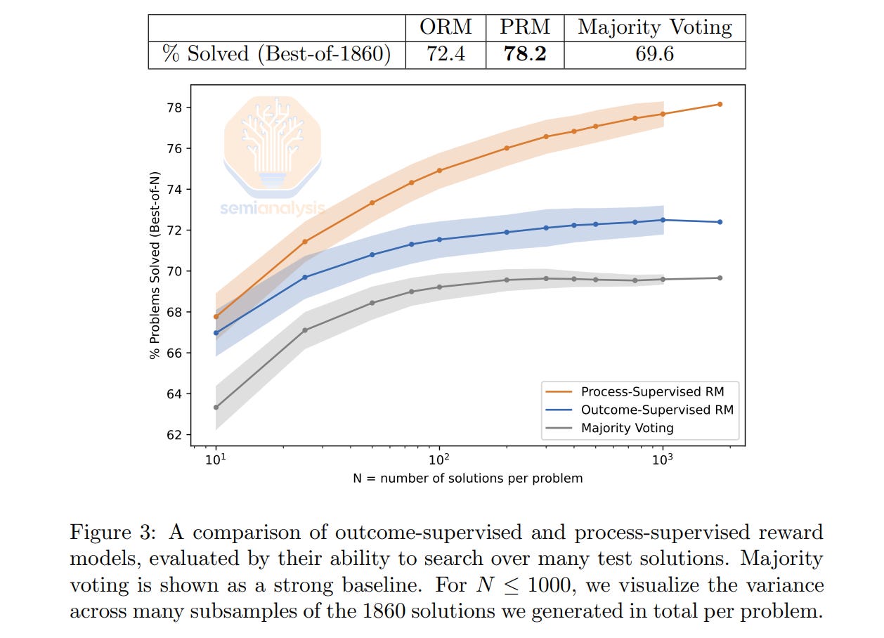 To recap our earlier explanation, there are two types of reward models: ones which provide a reward based on the outcome, an Outcome Reward Model (ORM), and ones which provide a reward based on the process, Process Reward Models (PRM). ORMs typically work by ranking a variety of different answers that a model provides and then selecting the highest ranked one. In contrast, PRMs evaluate and assign a score to each step of the reasoning chain of thought and provide a reward based on this score and for this reason are generally preferred when training Chain of Thought models. The Let’s Verify Step by Step paper showcased stronger results for PRMs over ORMs. With that said, OpenAI relies more heavily on ORMs still.