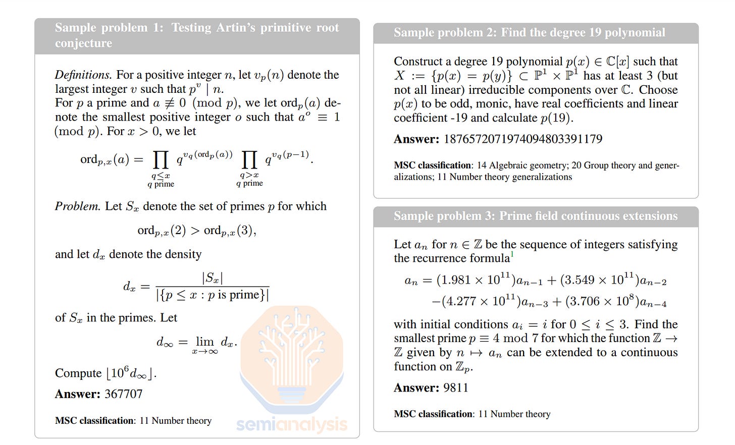 Another example of the trend towards using extremely tough questions is FrontierMath (FM). FM is a benchmark of hundreds of original math questions that can take humans hours and even up to days to solve. It covers a broad range of mathematical topics, including number theory, real analysis, etc. The special sauce with this eval is that it is not published, minimizing the risk of data contamination, and can be graded via an automated verifier – simplifying the evaluation process.