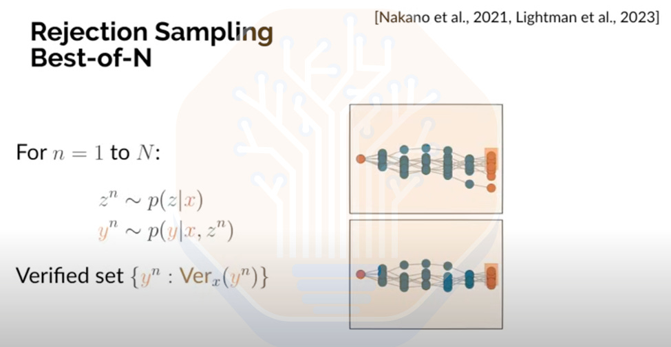 Best-of-N Sampling is another idea in which we generate N solutions for a specific prompt and then use a verifier model to identify chains-of-thoughts that led to the correct answer. This method is generally restricted to areas that are amenable to verification (e.g., sudoku and not essays) and is limited by the effectiveness of the verifier model.