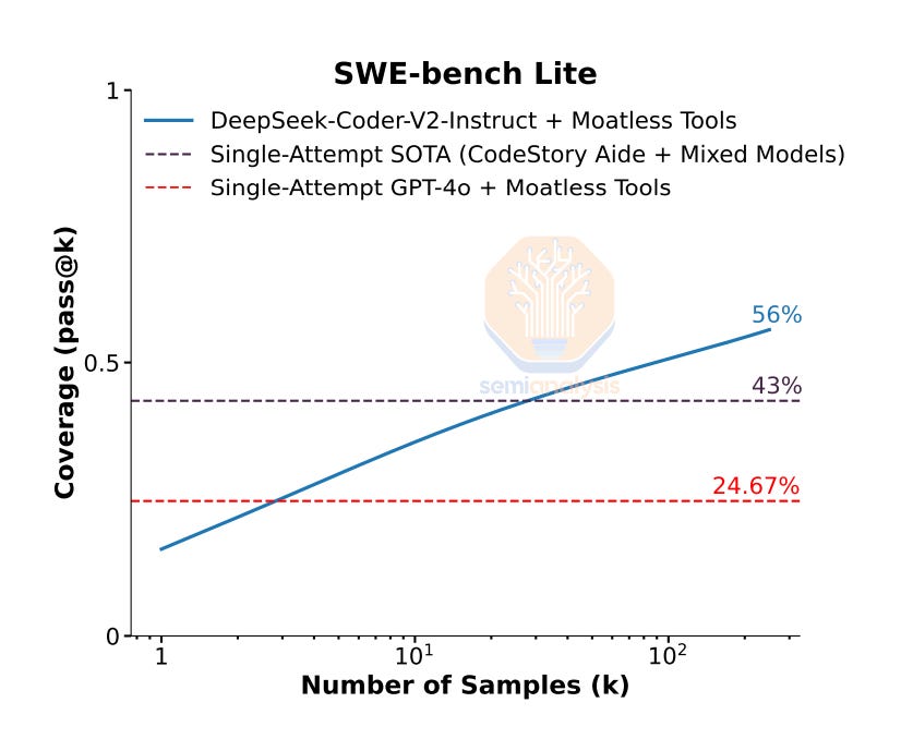 As we see from evals and from the graph further down below, with one attempt, GPT-4o beats other models. The most naïve way to scale test-time compute is to simply increase the number of samples concurrently being run, effectively channeling the infinite monkey theorem. The paper Large Language Monkeys demonstrates that simply repeated sampling can scale inference time compute and can yield much better results.