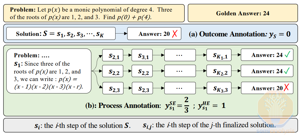 Automatic process annotation can generate this step-by-step process annotation. Instead of having a human evaluate an intermediate step, the Completer is used to create multiple different paths of reasoning steps. The Math-Shepherd paper uses automatic process annotation – generating a number of paths, then evaluating these paths by either marking it as a good reasoning step if it leads to a correct final answer (i.e. Hard Estimation) or by assigning a score based on the frequency with which the step leads to the correct solution (i.e. Soft Estimation).