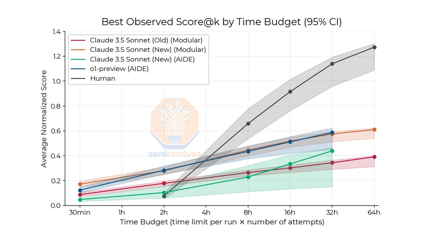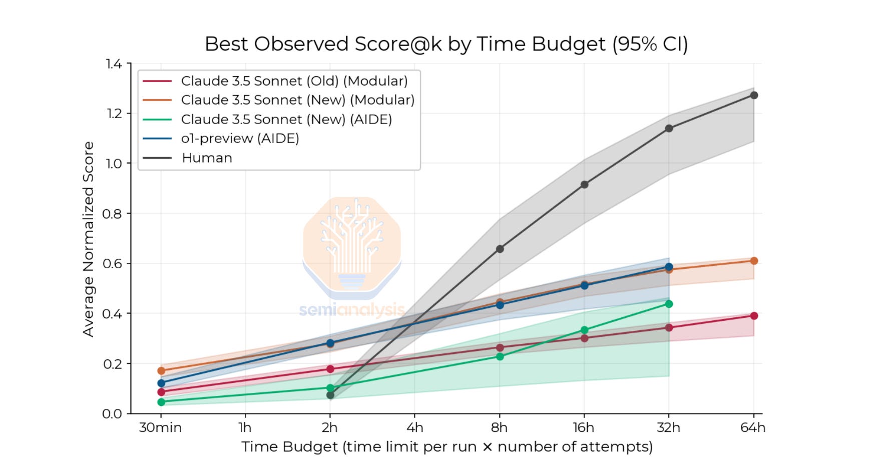 Another example is a benchmark investigating AI R&D capabilities, which some describe as “the most important capability to track.” Research Engineering Benchmark (RE) consists of seven challenging and open-ended ML research environments. Humans generally perform better on evals over longer time horizons, but, on a 2-hour time horizon, the best AI agents achieved a score 4x higher than humans. Important tasks such as the above, in which humans currently dominate, are the perfect ground for scaling inference time compute. We expect that models that better leverage this form of scaling will outperform humans in the future.