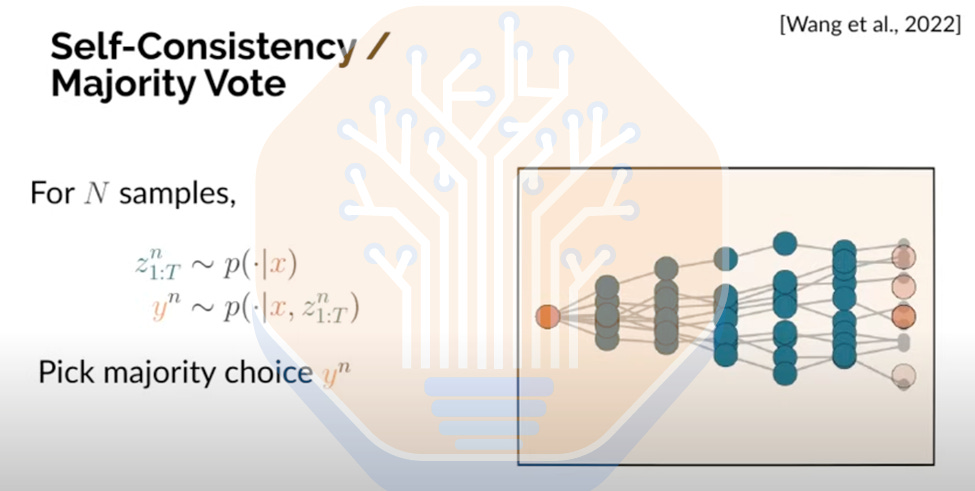 Self-Consistency / Majority Vote is one such search methodology in which we simply run the prompt through the model multiple times, thereby generating multiple responses, and then we pick the correct answer by choosing the response that appears most often among a given number of samples.