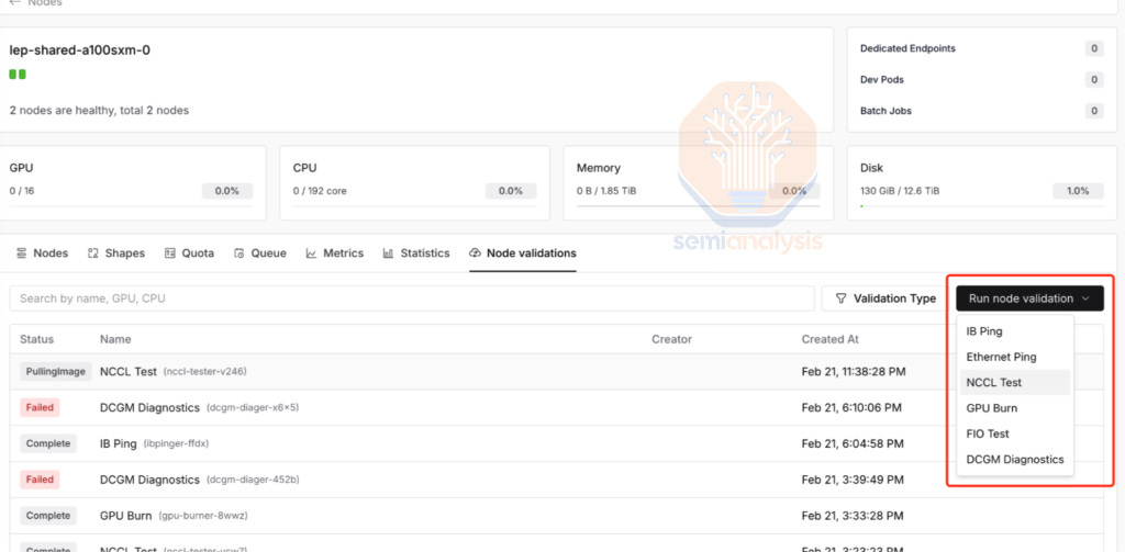 LeptonAI also has manual active health checks such as DCGM diag and nccl-tests, but this is run manually through the UI dashboard, and it is not done automatically on a weekly scheduled basis like CoreWeave and LeptonAI do not provide reference numbers for what NCCL tests should be. We recommend that they implement an option for customers to opt-in to having automatically actively scheduled health checks. LeptonAI also does not have Megatron Loss convergence active health checks or have Nvidia TinyMeg2 SDC detector active health checks.