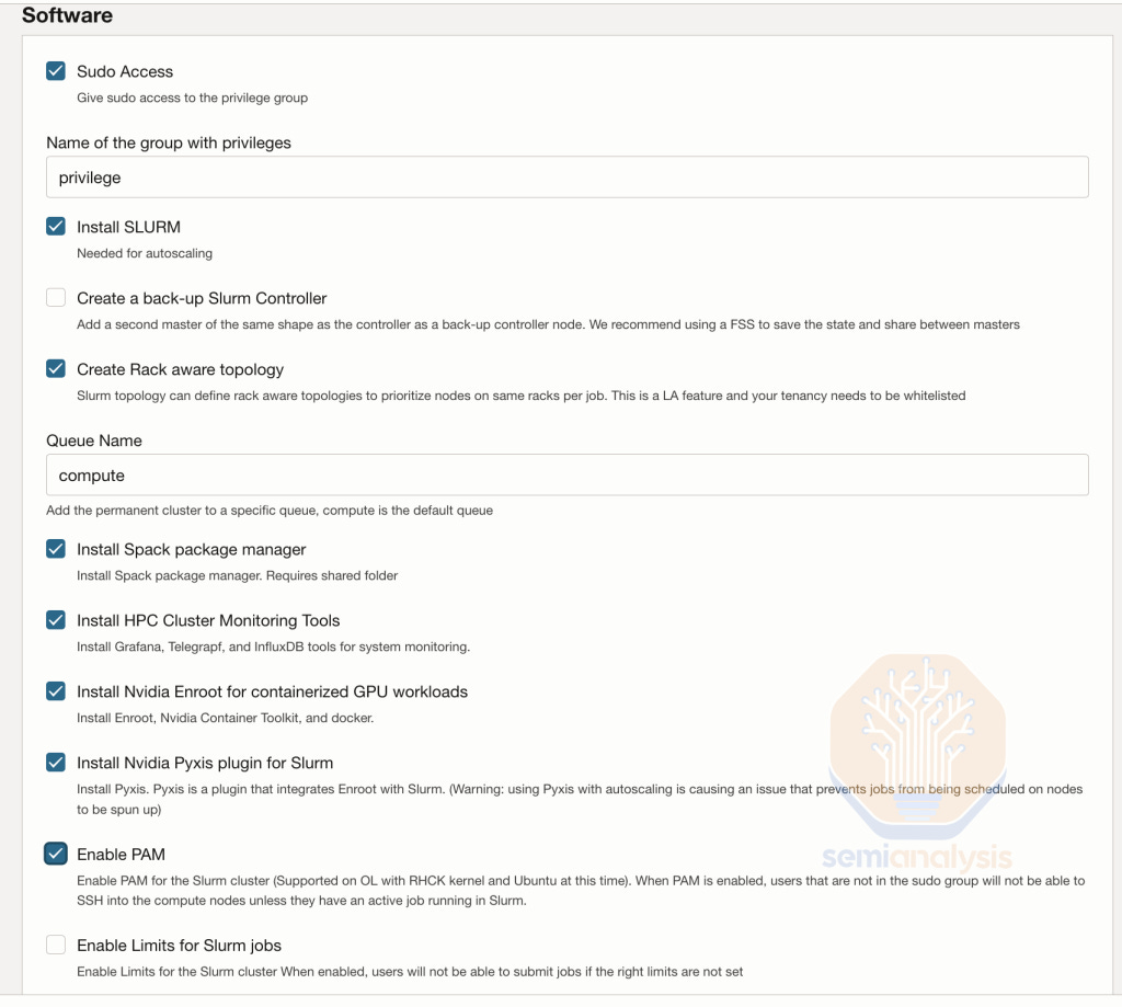 From our testing, OCI's GPU experience is strong and consistently recognized as the most cost-effective among the four major Hyperscalers. Their GPU offerings come with a one-click UI deployment from the OCI marketplace called “OCI HPC stack” for both Slurm and monitoring. However, despite this impressive setup, OCI’s Slurm solution isn't fully managed—it currently operates as a co-managed offering supported by one or two of OCI’s solution architects. To remain competitive, especially against AWS's and CoreWeave's comprehensive managed Slurm solutions (the latter having an exceptional node lifecycle controller and automated active health checks), we strongly recommend OCI invest in a fully managed “Oracle Managed Slurm (OMS)” offering, which would benefit the gamut of Oracle customers (sans OpenAI, due to their AGI safety policies).