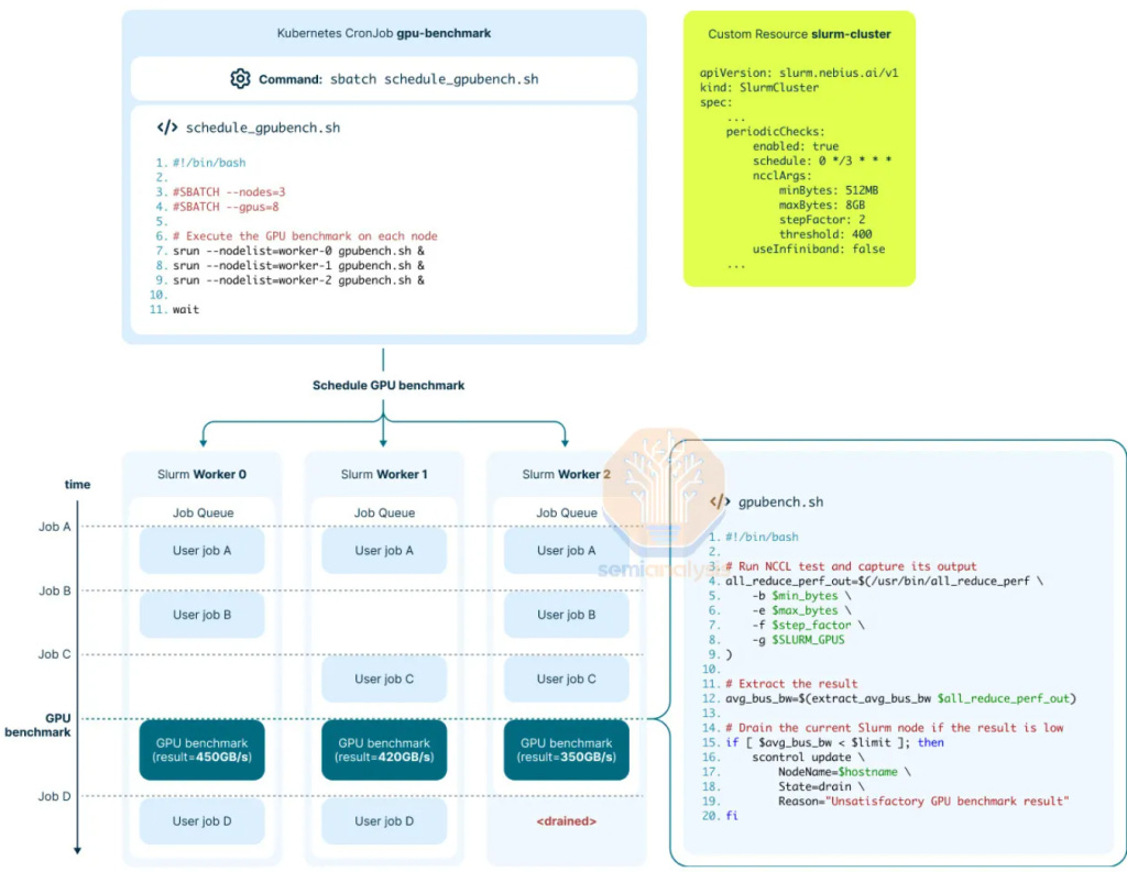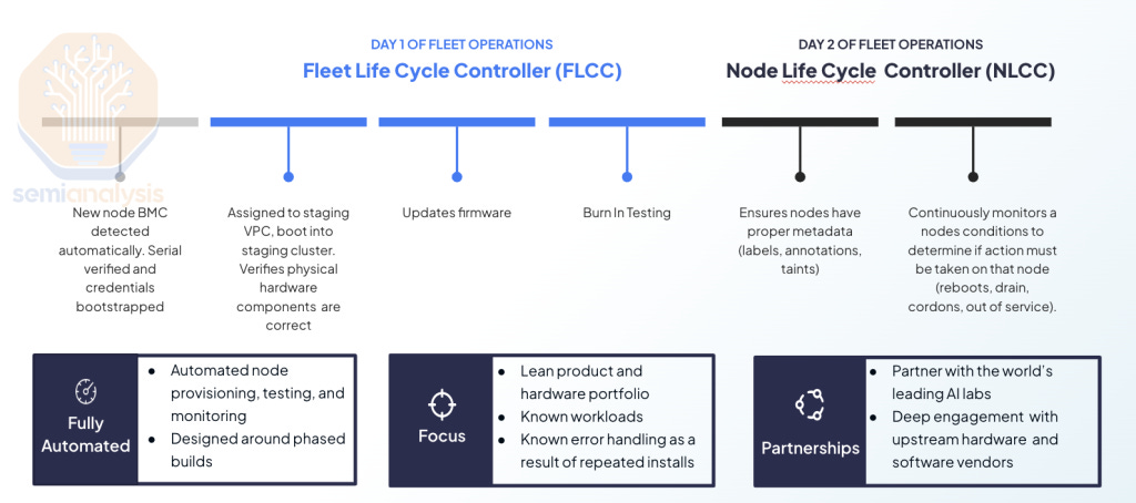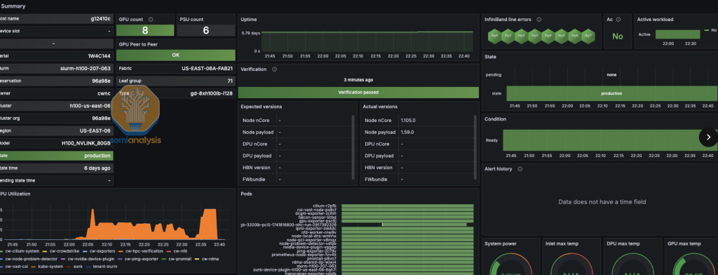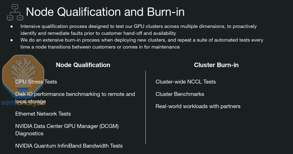 Finally, Nebius currently offers a fully managed Kubernetes solution but does not yet provide fully automated managed Slurm clusters, a significant gap in their product portfolio. They are actively developing their "Soperator" Slurm solution, which includes foundational passive and active health checks. However, these checks still fall short of industry-leading standards set by providers like CoreWeave. To match competitors' reliability and observability, Nebius will need to invest more heavily in comprehensive, weekly scheduled active health checks and implement advanced out-of-the-box Grafana dashboards. Strengthening these operational aspects would further enhance their already compelling value proposition by increasing reliably to the level of CoreWeave and having automated node lifecycles.