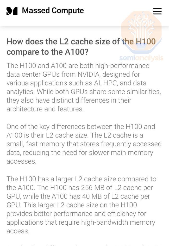 If you click into the link, it starts the H100 L2 cache size is 256MB which is completely wrong. We recommend that Massed Compute stop spamming the internet with AI-generated junk.