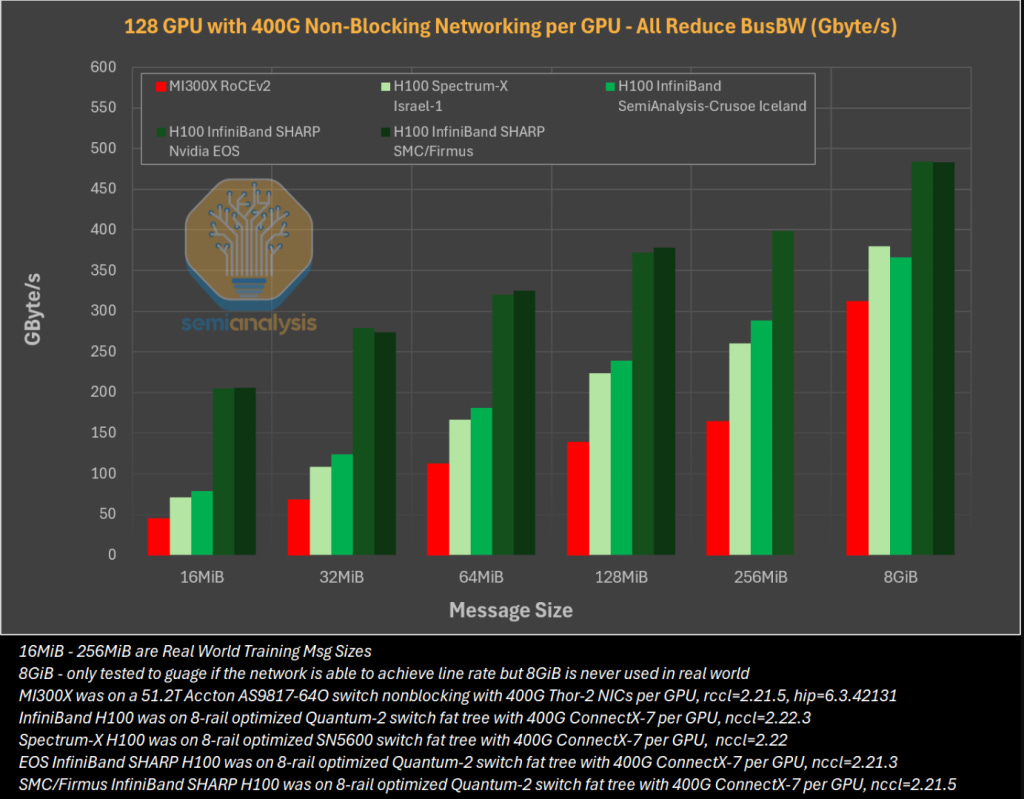 AWS’s P5 EFAv2 instance is 32x100GbE, which is worse than InfiniBand/Spectrum-X/RoCEv2 but better than the GCP a3-mega instance (8x200GbE) released in April 2024 from our nccl-tests testing. Our NCCL tests also show that their H100 p5 EFAv2 offering has better networking than GCP a3-mega, and their new H200 p5en EFAv3 (16x200GbE) offering has better networking than GCP a3-mega. GCP's new h200 a3-ultra offering which was released to public in January 2025 which has 8x400GbE RoCEv2 ethernet has better networking performance than AWS's new p5en EFAv3 offering. We will show the results and benchmarks we ran on real-world message sizes in our upcoming nccl/rccl networking deep dive article.