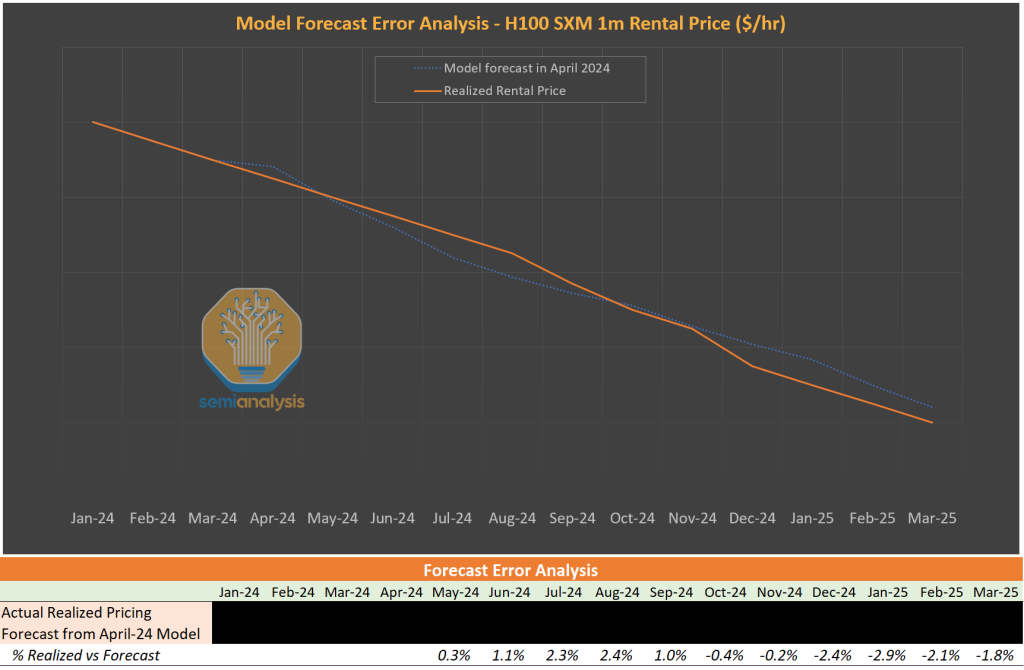 Back in April 2024, our pricing model in the AI Cloud Total Cost of Ownership Model suggested such an outcome. GPU prices declined throughout 2024 due to a ramp up in H100 production, with this decline continuing into late 2024 as buyers pivoted to focus on their Blackwell strategy. One year later, our forecasts have been dead on, with a 2-3% margin of error for H100 SXM.