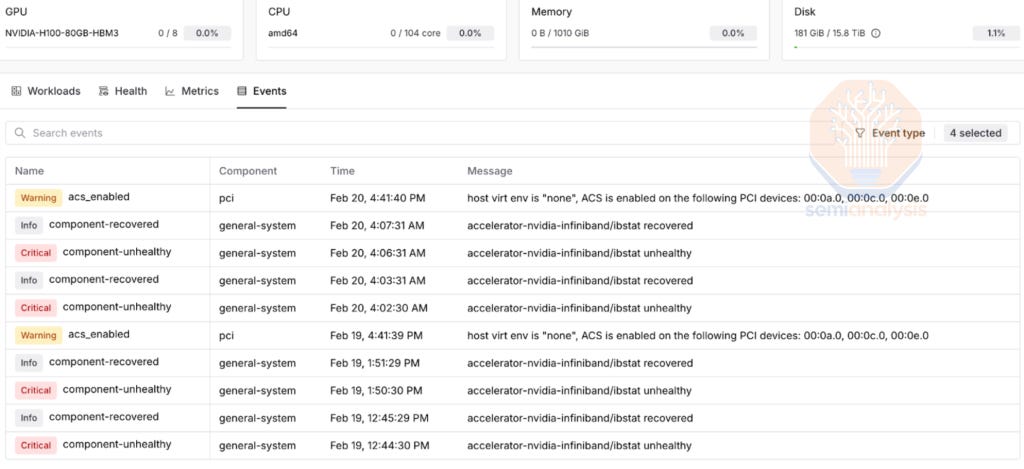 However, Lambda still lacks several essential features, such as automated passive and active health checks, and its metrics dashboard currently omits crucial GPU metrics that are found in competitor solutions, like CoreWeave. We recommend to Lambda Labs that they look into what CoreWeave has for passive and active health checks and implement a metrics dashboard comparable to CoreWeave’s fantastic out of the box Grafana dashboard.