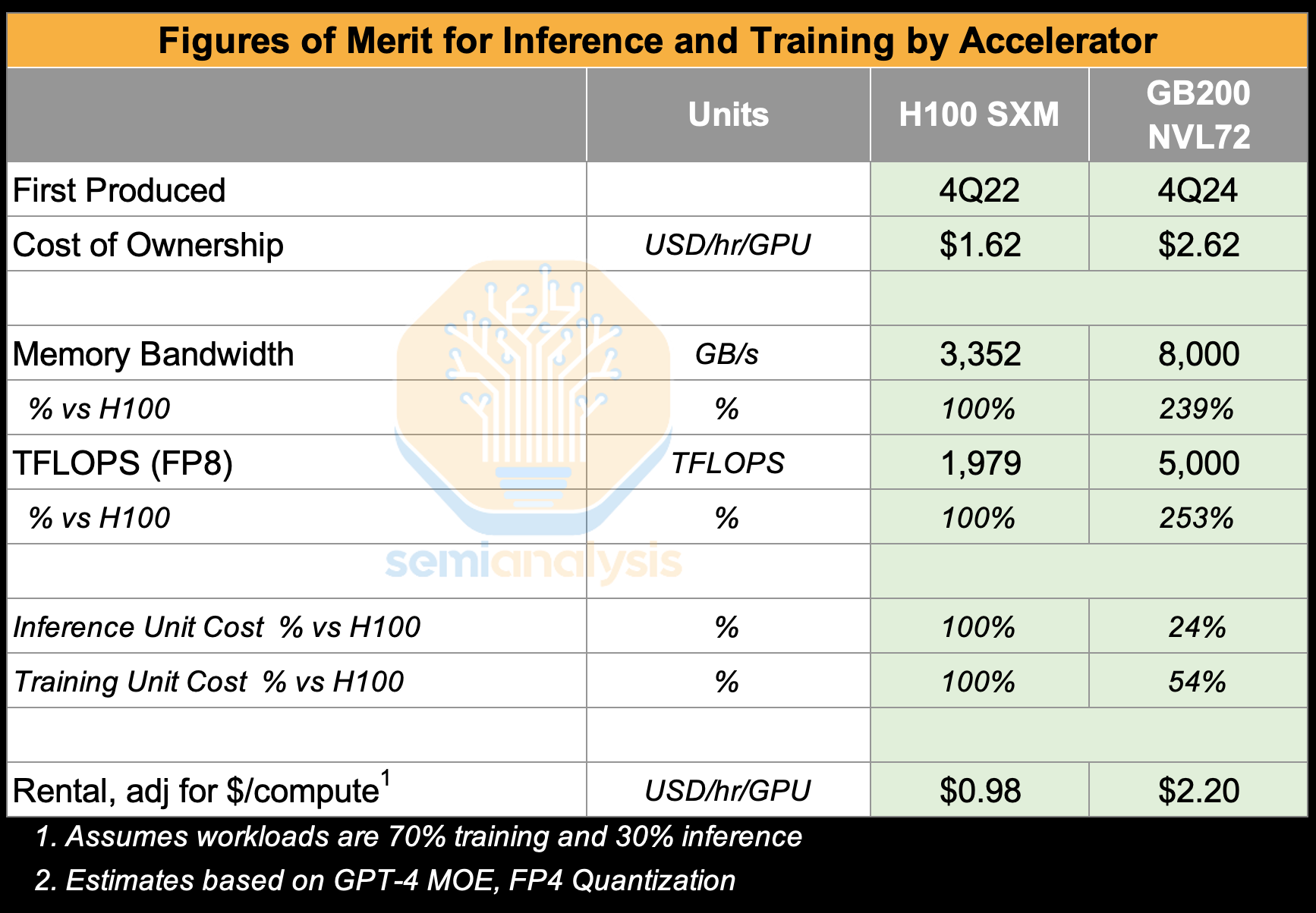 The below table provides a simple example of the workings behind this forecast. Here, we see that the GB200 NVL72 offers a 75% lower inference unit cost in terms of $/M tokens vs an H100 and a 56% lower training cost in terms of $/hr per effective PFLOP. This means that if the GB200 NVL72 sets the market cost of compute, then the H100 would have to be priced 65% lower per hour than the GB200 NVL72 in order for buyers to be indifferent between renting the two. The H100 would have to be set at a rental of $0.98 per hour per GPU to compete with a GB200 NVL72 priced at $2.20 per hour per GPU.