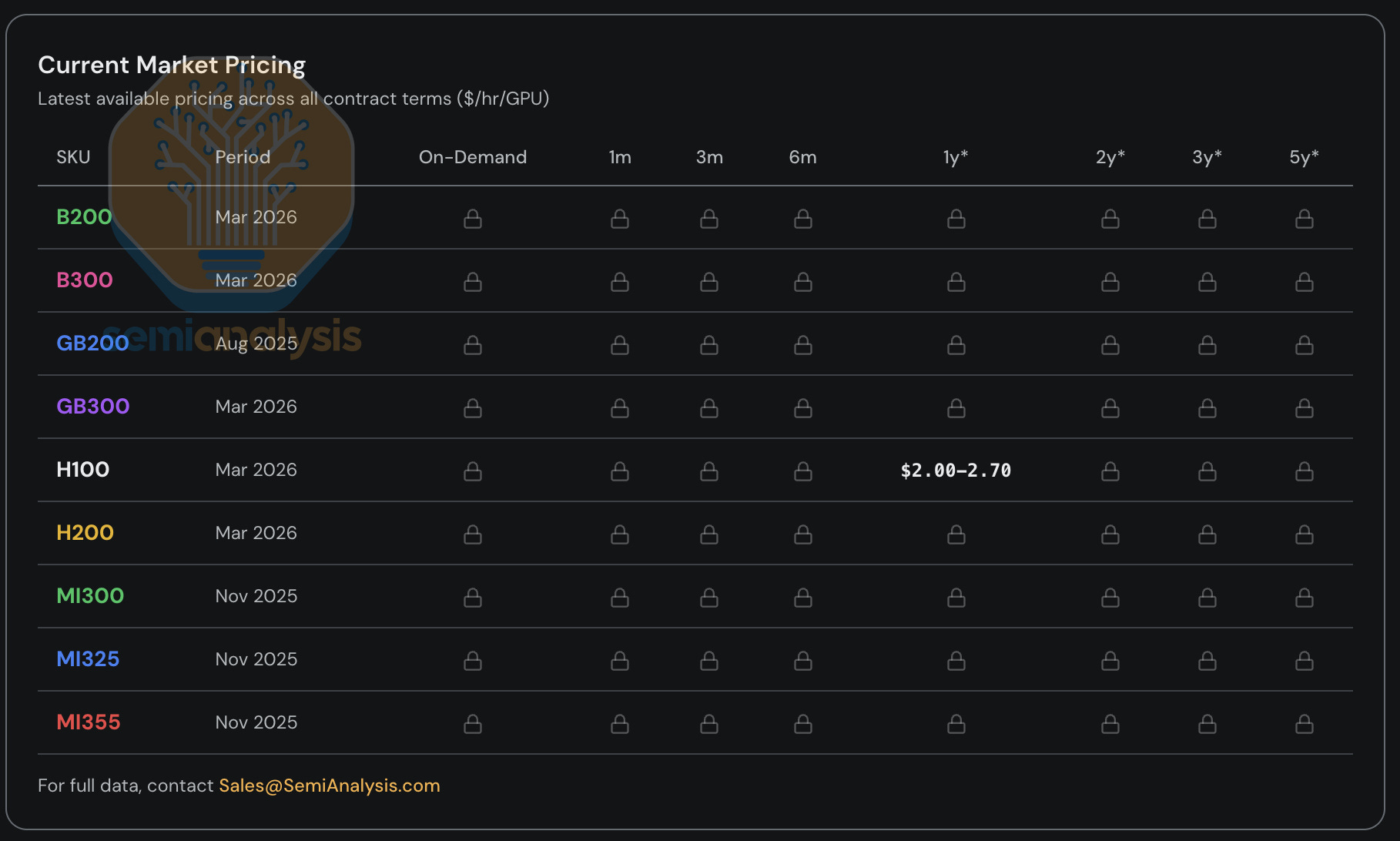 Since 2023, for our clients, we have maintained GPU rental price indices tracking pricing for most major GPU types (H100, H200, B200, B300, GB200, GB300, MI300, MI325, MI355) across all key rental terms, from on-demand and 1 month all the way to 5 years. Our index is constructed using survey data polling many Neoclouds and buyers of compute which is also validated by transaction data as well as by negotiations and transactions we ourselves are facilitating.