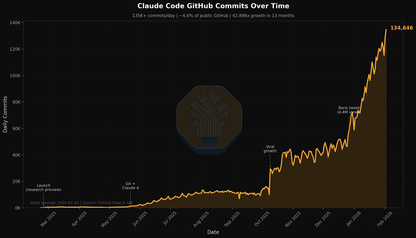 We are tracking the overwhelming demand through proxies like Claude Commits Daily. At the current trajectory, we believe that Claude Code will be 20%+ of all daily commits by the end of 2026. While you blinked, AI consumed all of software development. Institutional clients who are interested in the data set can reach out to our API documentation team.