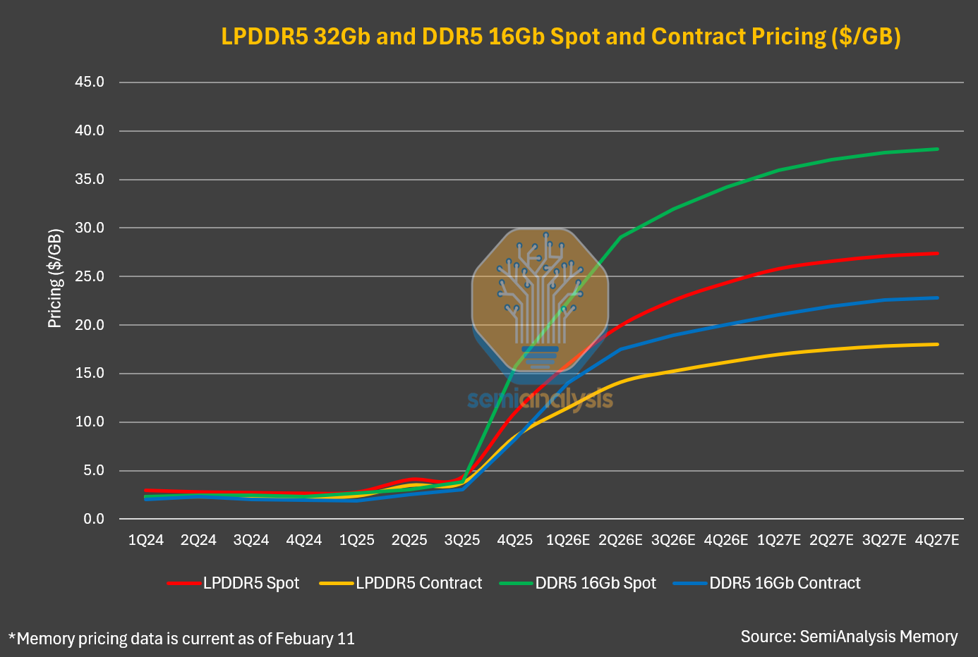 January was the next inflection point for compute when memory pricing, across both DRAM and NAND pricing, went from rising aggressively for several quarters, to going completely parabolic, with LPDDR5 and DDR5 contract prices tracking toward ~4x and ~6x year-on-year increases respectively in 1Q26.