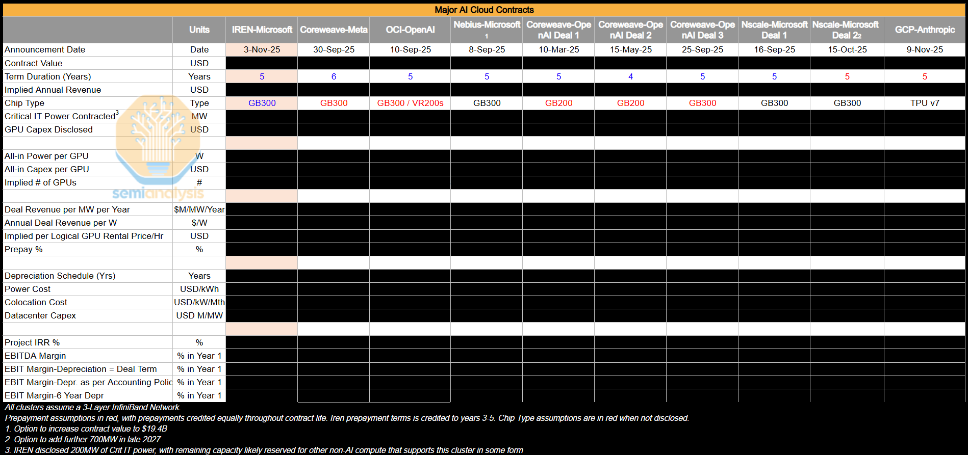 The below table shows a number of large offtake deals we have been tracking. We analyze these deals closely to calculate the implied pricing in $/hr/GPU and profitability metrics like Project IRR, EBIT Margins, etc.
