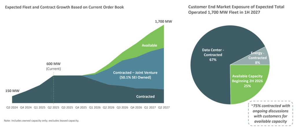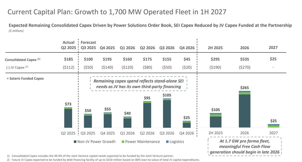 The newly formed JV already spent $112 million in capital expenditures in Q2 2025. After a slow Q3, spending will pick up again in Q4 2025 and Q1 2026. Solaris expects to have over 1.1GW of fully operating turbines for xAI by Q2 2027. There remains ~425MW available for contracting, and we think xAI will likely pull the trigger to get to over 1.5GW of total gross power. Solaris also appears to temporarily lease power generation capacity from third parties to deliver faster: