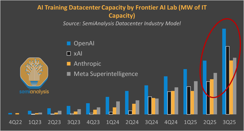 Short answer: no. xAI is still squarely in the frontier-AI race and is positioned to leapfrog most rivals again on compute. By our estimates, its total datacenter capacity for a single training cluster will surpass Meta Superintelligence and Anthropic by Q3 2025. The datacenter capacity will be ready for the GPUs to be moved in to create the largest single datacenter in the world, yet again. xAI has to raise the capital for those GPUs, but they have the allocations from Nvidia to have it fully training large scale models early next year.